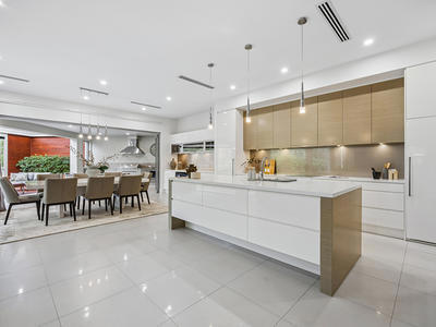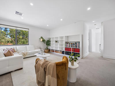 The ground level offers a thoughtfully designed layout, featuring a dedicated study, elegant formal lounge with a cosy gas feature fireplace, powder room, and a luxurious main bedroom suite complete with walk-in robe, ensuite and sliding doors opening to the rear garden. The heart of the home is the spectacular open-plan living zone, where a superb designer kitchen takes centre stage—equipped with Siemens appliances, integrated fridge, large walk-in pantry and stylish cocktail cabinetry with beverage and wine fridges—seamlessly servicing the expansive family and dining areas.